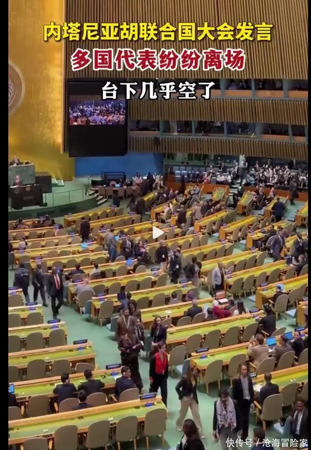 以色列代表团以及内塔尼亚胡请来的亲友团则全体起立,大声鼓掌,试图转移视线。内塔尼亚胡发言时,旁听席上坐着轮椅的以色列被扣押人员家属两次冲其抗议喊叫,随后被保安带走。 同时,以色列常驻联合国代表发帖,对离开会场的各国代表说:“滚吧,别再回来!” 面对着空了一大半的场地,内塔尼亚胡脸色铁青,但掩饰不了的内心慌乱,现场的媒体还特地将镜头拉到伊朗代表的桌上,上面有一张当时伊朗和以色列爆发冲突,以色列空袭造成伊朗儿童死难的照片。