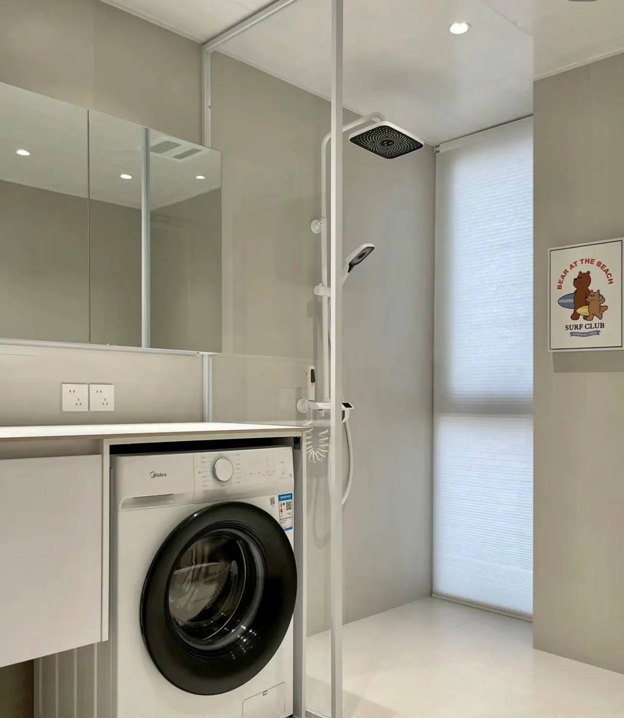 虽然从洗澡脱衣的动线上来说,这个位置也没那么糟糕,但这是在不晾晒,用烘干机的前提下而言的。
