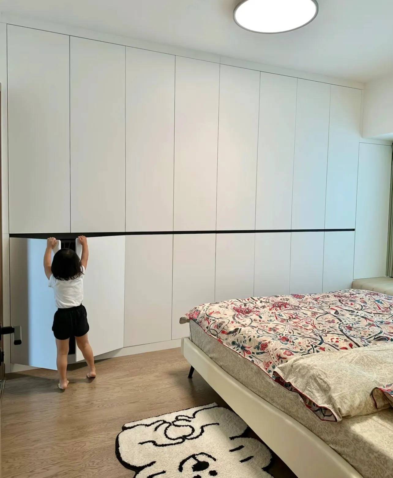 只要卧室宽度超过2.25米,就可以给床尾去添加满墙衣柜了,会比户型本身设计的小小衣柜,增加许多衣柜空间,也能放一些额外的杂物。